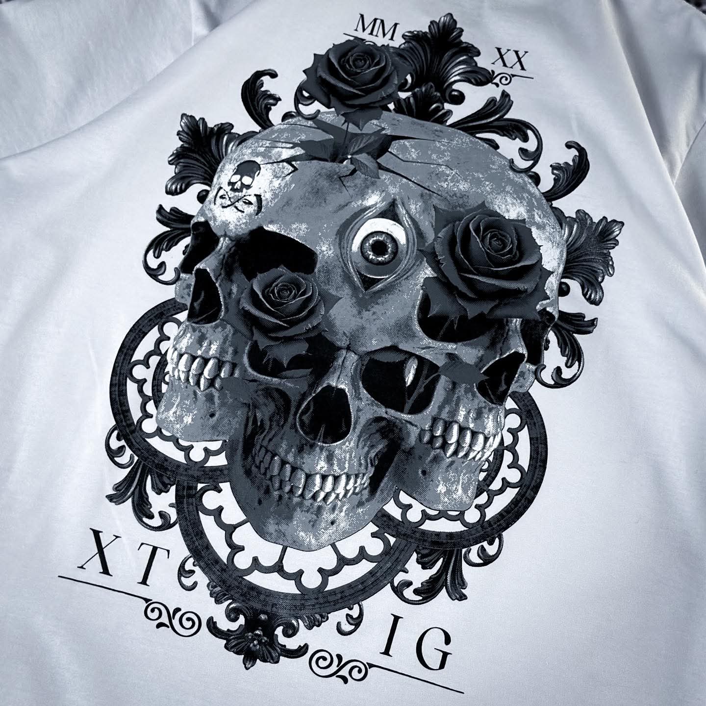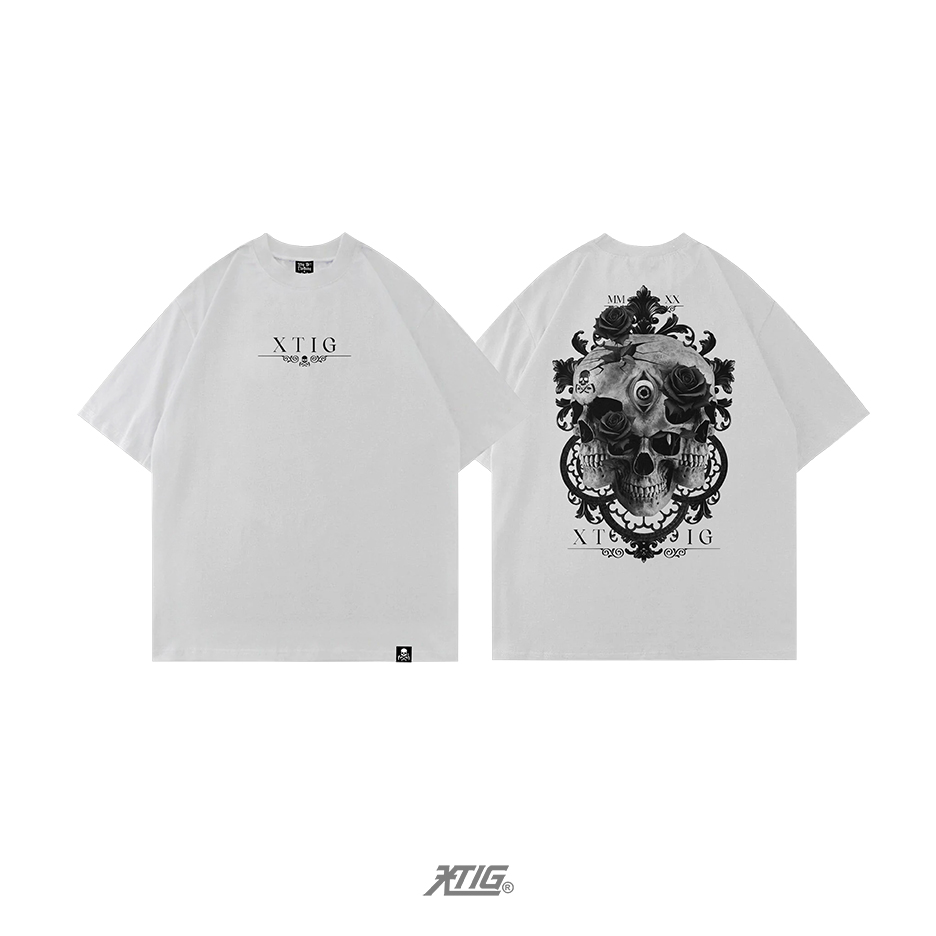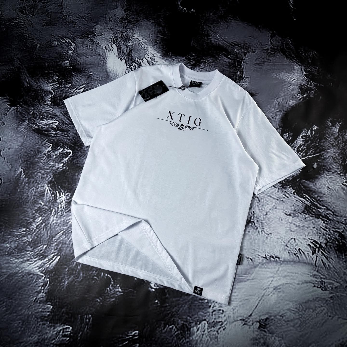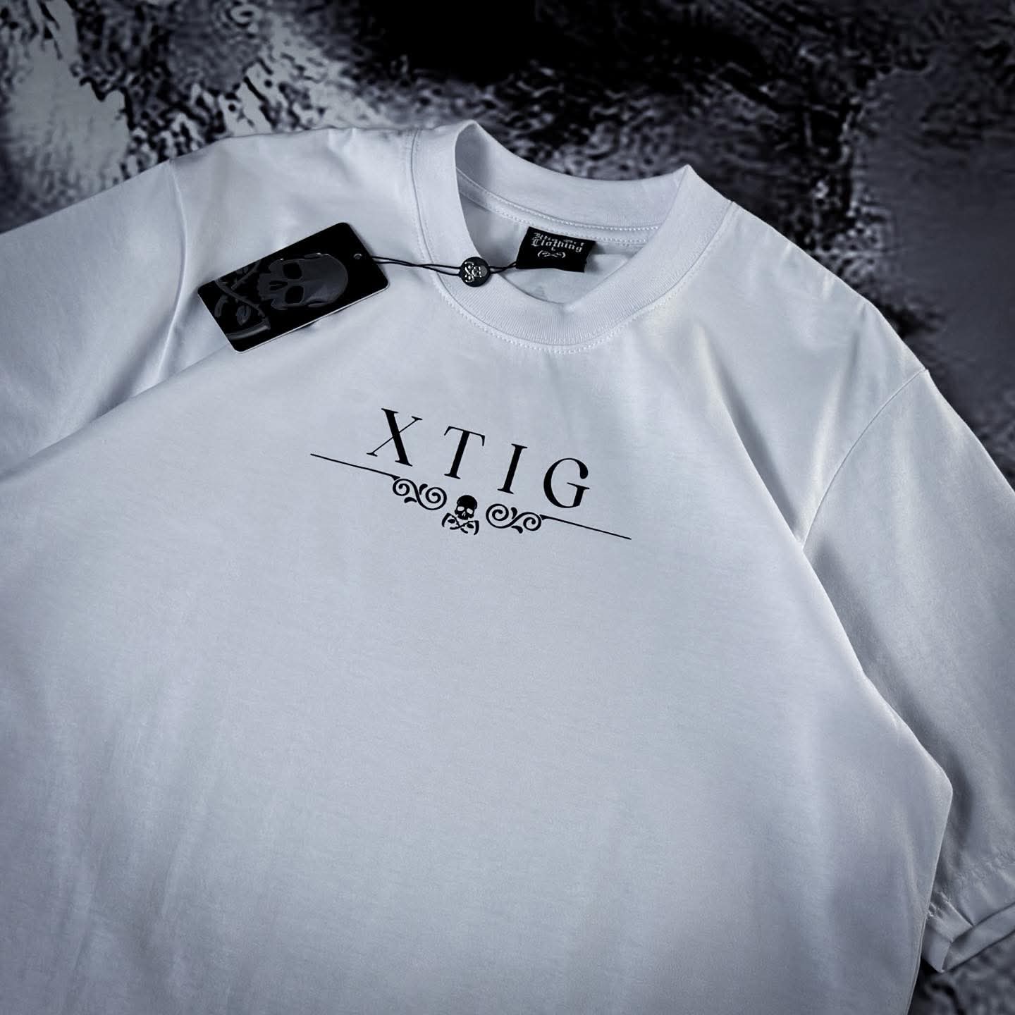 >XTIG woven tag attached on inside back neck, lower left side, and left side sleeve of the shirt.