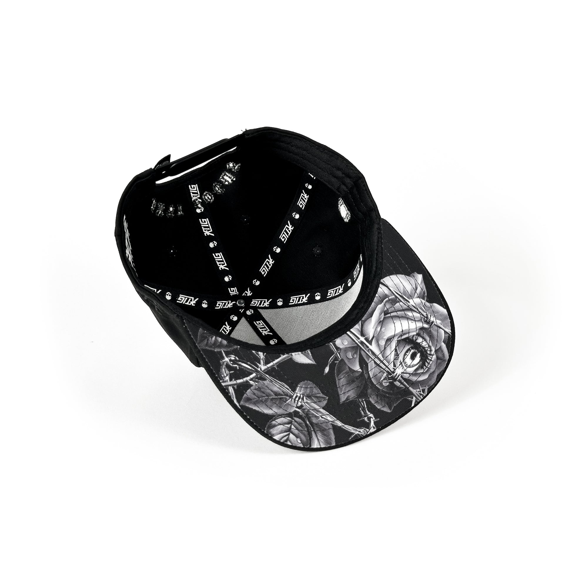The Thornscript blends minimalism with rebellion. Its sleek black crown is marked by an embroidered XTIG calligraphy logo, while underneath, a striking rose-and-thorn print hides in plain sight. A perfect balance of elegance and edge — made for those who carry beauty with bite.