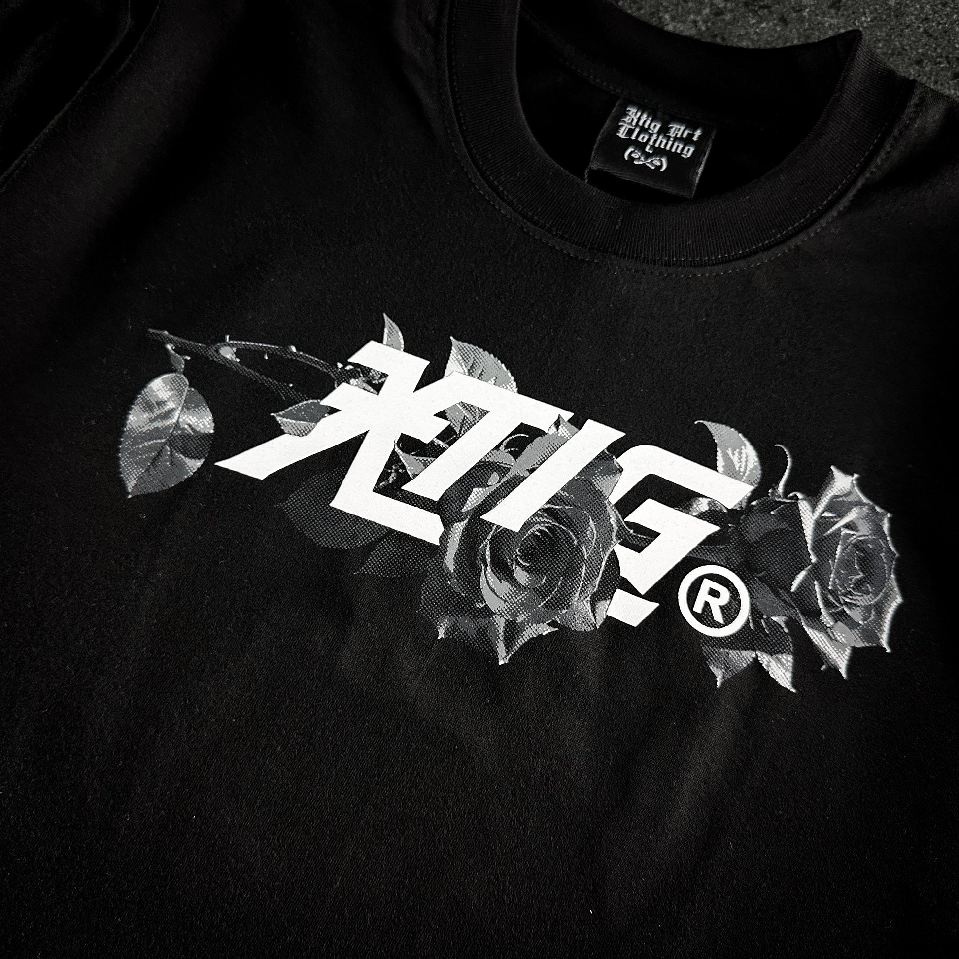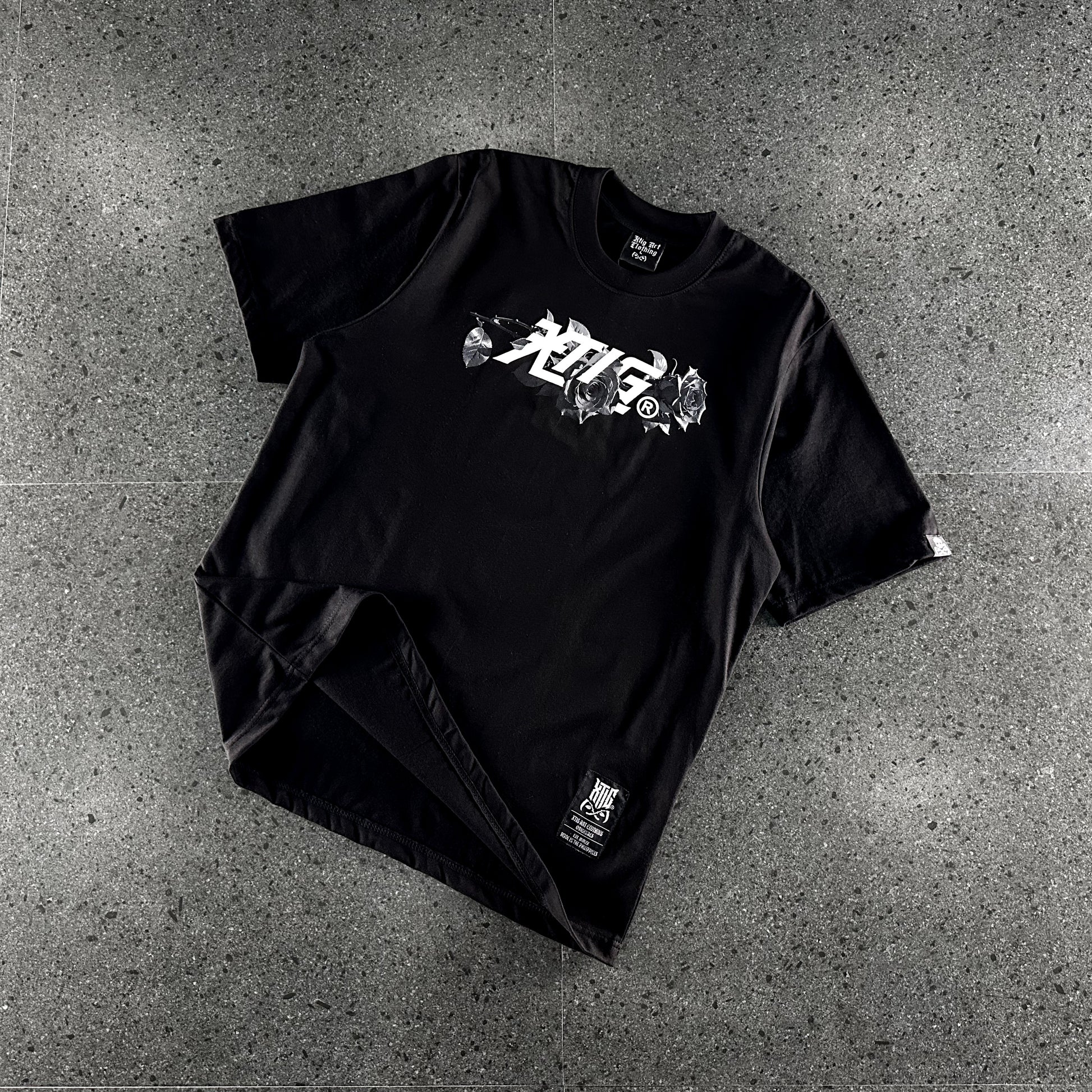 >XTIG woven tag attached on inside back neck, lower left side, and left side sleeve of the shirt.